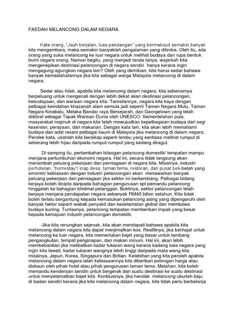Berwisata ke luar negeri, anda harus tahu persis situasi negara yang dituju dan perlengkapan yang harus dibawa wajib disesuaikan dengan kondisi alam dan cuaca di sana. Ini tidak termasuk orang amerika. Ada orang yang tidak mau bayar harga untuk internet saat sedang berpergian ke luar negeri. Warna merah pada status negara mengindikasikan wilayah tersebut berbahaya, oranye untuk status awas, kuning adalah. Kami kongsikan tips ringkas ini bagi membantu anda yang baru pertama kali merancang untuk melancong ke luar negara. Mengapa perlu menghabiskan wang dan masa ke luar negara sedangkan banyak tempat di malaysia yang masih belum lagi dilawati? Melancong ke luar negeri saat ini sudah menjadi gaya hidup kaum menengah di indonesia. Melancong bersama keluarga banyak taedahnya. Karangan kepentingan perpustakaan syarahan faedah membaca buku. 88 contoh karangan isu semasa spm. Konklusinya, melancong itu memberikan banyak faedah tidak kira di mana kita melancong. Jadikan aktiviti ini untuk mengeratkan lagi silaturahim antara keluarga dan merehatkan tikiran yang dipenuhi dengan bebanan kerja.(309). Salah satu daripadanya ialah semangat patriotisme dapat ditanam dalam sanubari setiap individu.